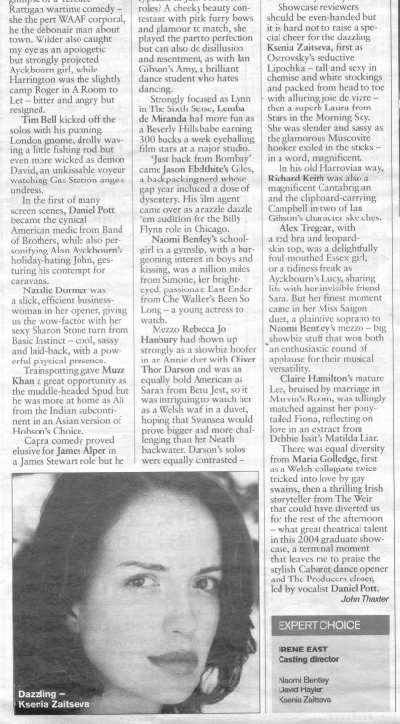 Showcase reviewers should be even-handed but it is hard not to raise a special cheer for the dazzling Ksenia Zaitseva, first as Ostrovsky's seductive Lipochka - tall and sexy in chemise and white stockings and packed from head to toe with alluring joie de vivre - then a superb Laura from Stars in the Morning Sky. She was slender and sassy as the glamorous Muscovite hooker exiled in the sticks - in a word, magnificent.